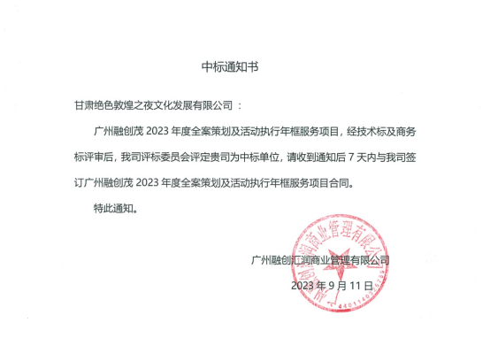 9月11日,在歷經三輪的競價談判,經過層層篩選和激烈角逐,甘肅文旅集團旗下甘肅文旅運營集團子公司甘肅絕色敦煌之夜文化發(fā)展有限公司成功中標廣州融創(chuàng)茂2023年度全案策劃及活動執(zhí)行年框服務項目。